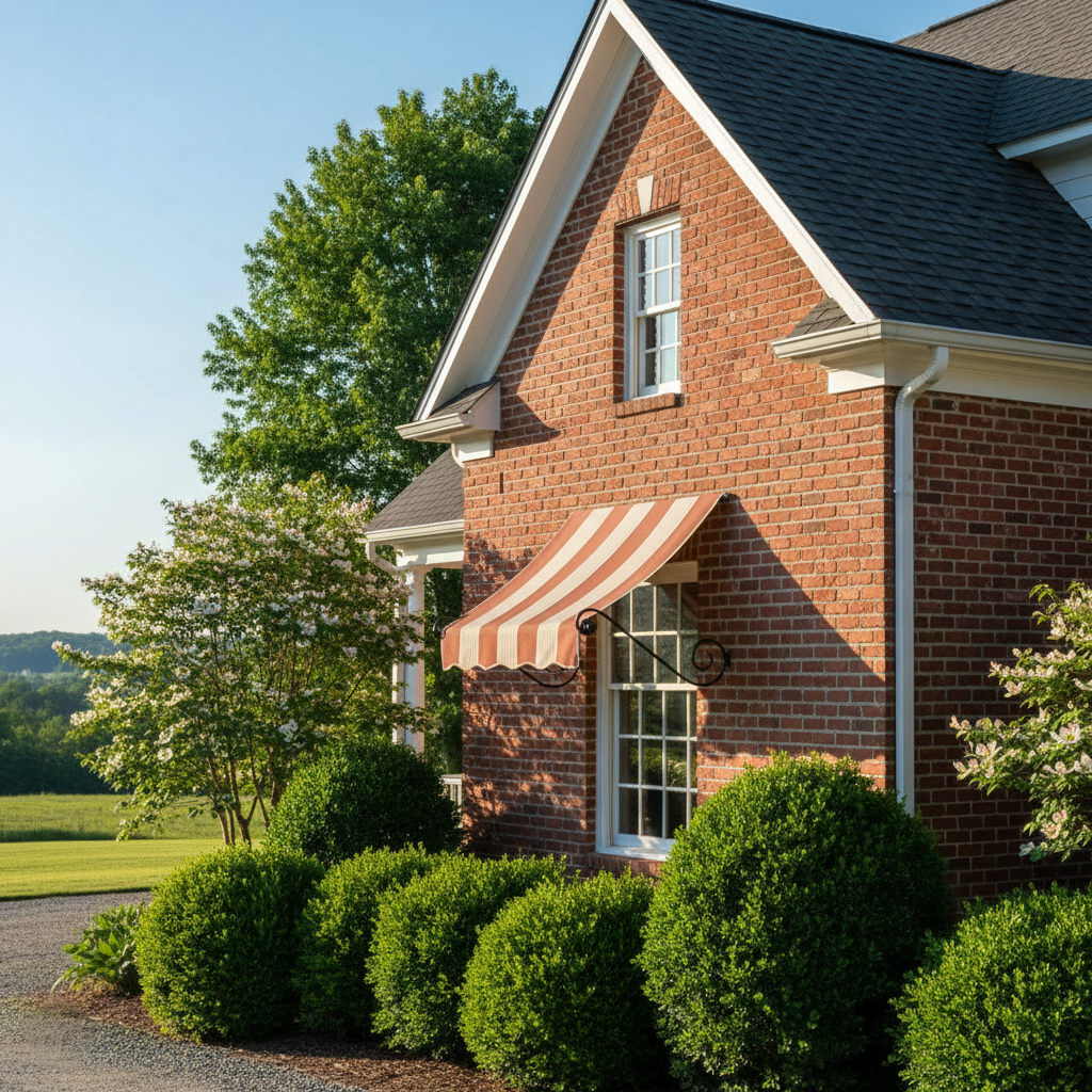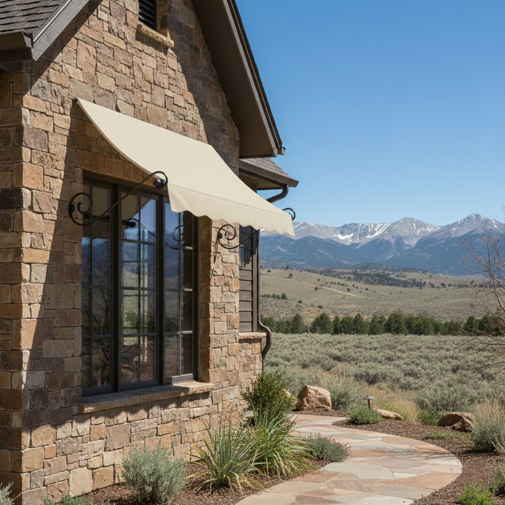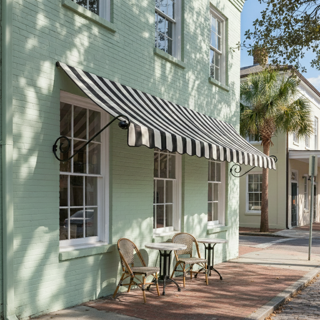 The Charleston Fixed Awning adds a refined architectural touch to homes, cafés, multifamily buildings, retail storefronts, and commercial properties. Its signature black iron scroll arms offer both structural support and decorative charm, giving any space a warm, elevated look.