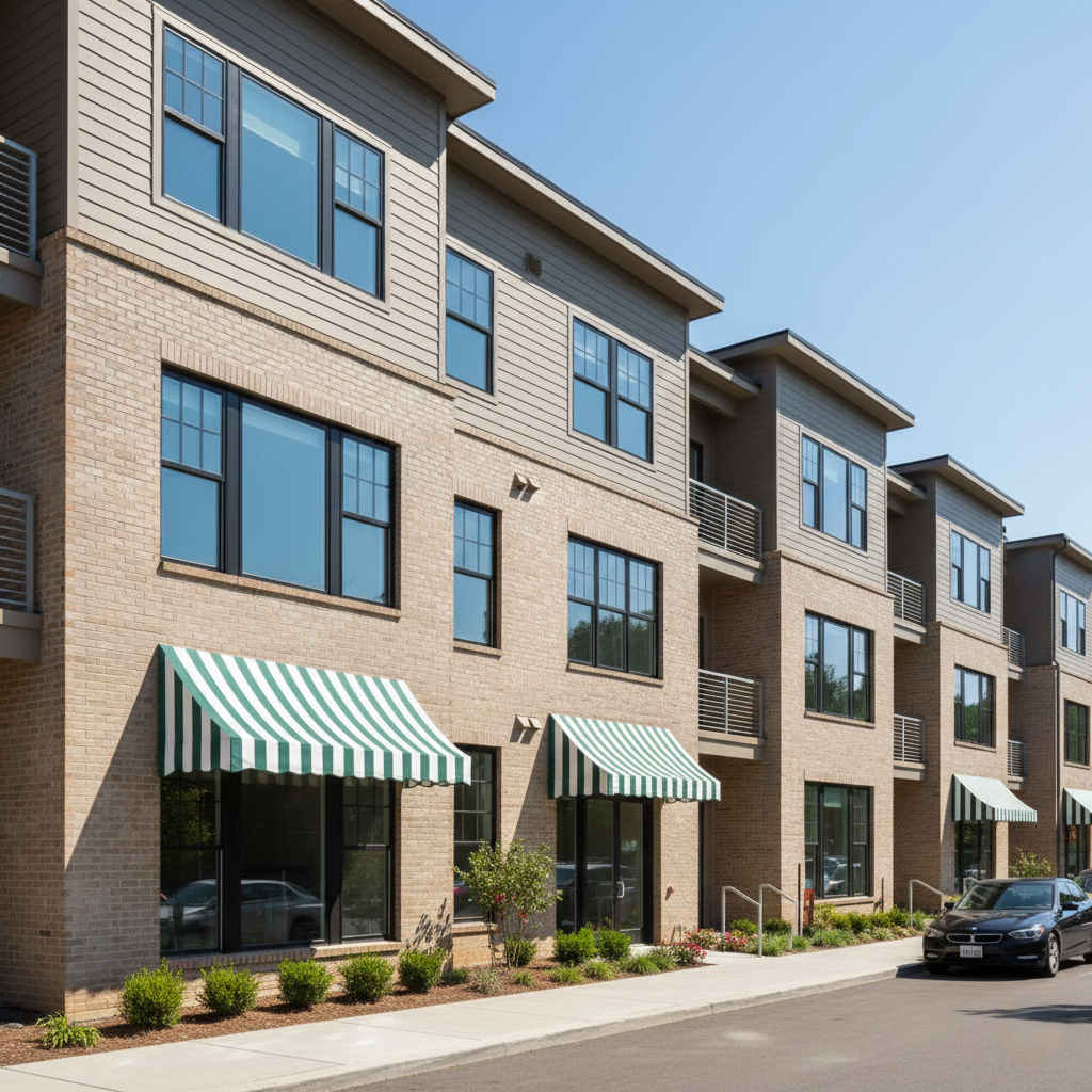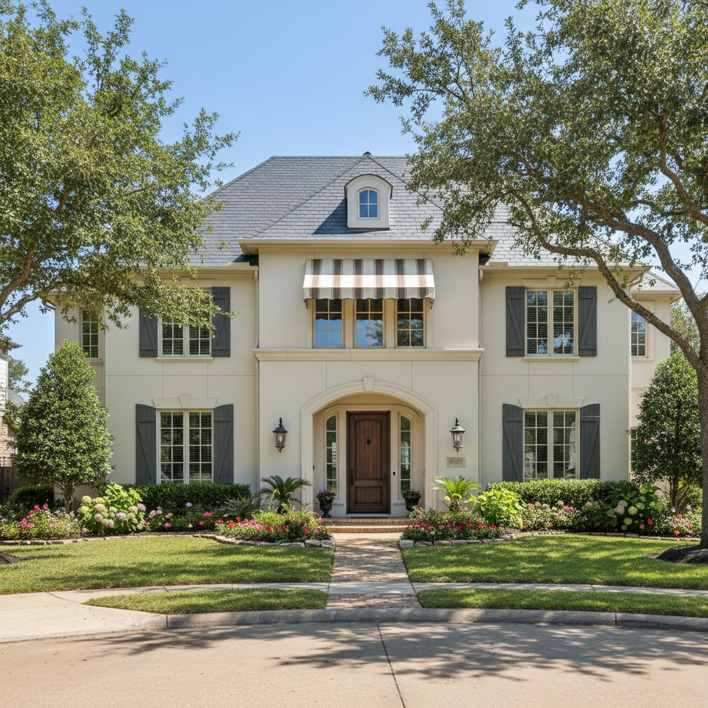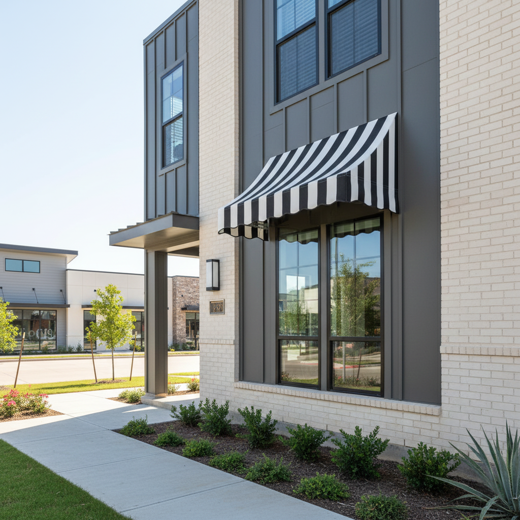 - Crescent-style fixed awning suitable for homes, retail spaces, cafés, and multifamily buildings